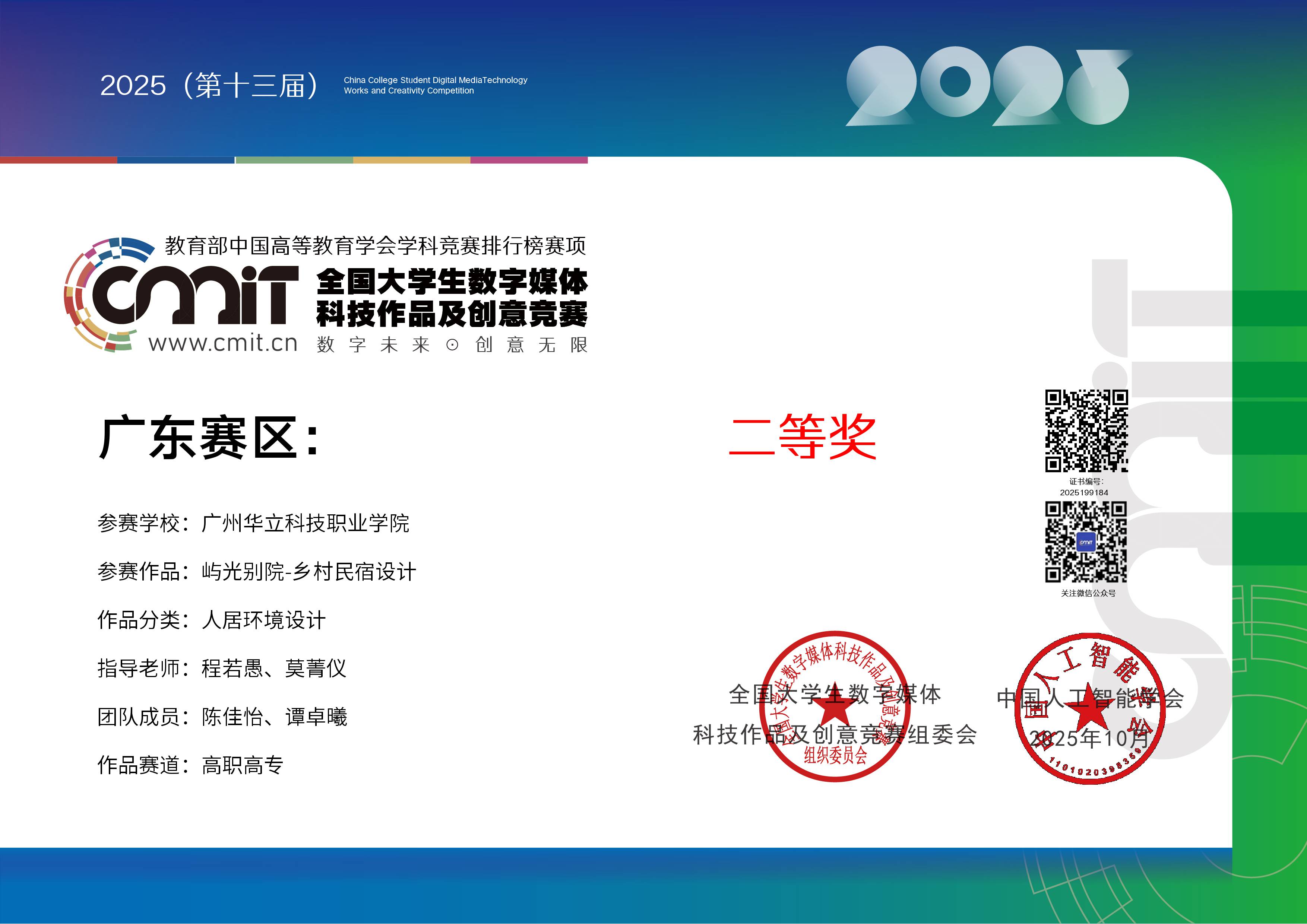 其中,由程若愚、莫菁仪、陈华林老师指导,陈佳怡、冯明月等同学完成的作品《屿光别院-乡村民宿设计》、《星火传承,红色铸魂”--党建主题公园景观设计》在全国大学生数字媒体科技作品及创意竞赛全国总决赛中荣获三等奖2项,广东赛区中获二等奖2项;由田娅娟、莫菁仪、陈华林老师指导,何颖诗、冯君怡等同学完成作品《池上幽居静寄山庄池上居复原与改造设计》、《“庐州轨迹”--道路节点绿化景观工程恢复设计》荣获广东赛区三等奖2项。