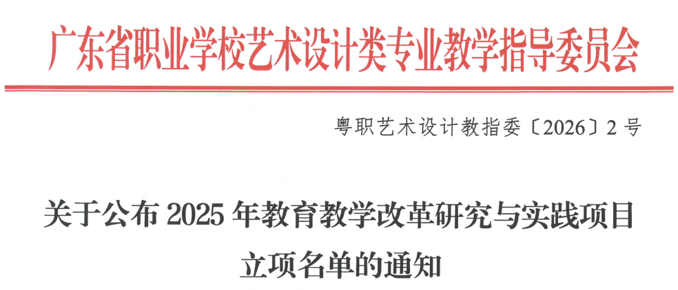 近日,广东省职业学校艺术设计类专业教学指导委员会公布了2025年教育教学改革研究与实践项目立项名单。我校艺术与传媒学院在此次评审中取得优异成绩,共有4位教师团队申报的项目获得立项。