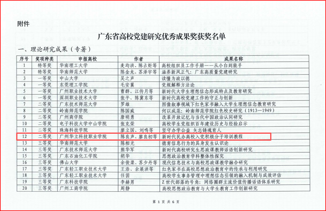 广州华立科技职业学院荣获广东省高校党建研究优秀成果奖二等奖