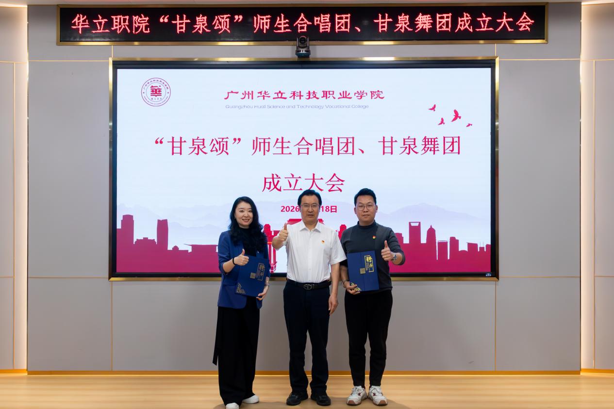 2026年3月18日,广州华立科技职业学院“甘泉颂”师生合唱团、甘泉舞团成立大会在图书馆104会议室隆重举行。学校常务副校长马俊,人事处处长钟文浩,教务处处长孙丽英,评建办主任李艳华,校团委书记张超越,马克思主义学院院长廖良初,艺术与传媒学院院长朱君、党总支书记兼副院长陈改梅,健康学院副院长吴丽萍等领导嘉宾,与合唱团、舞团全体成员齐聚一堂,共同见证这一校园文化建设的重要时刻。