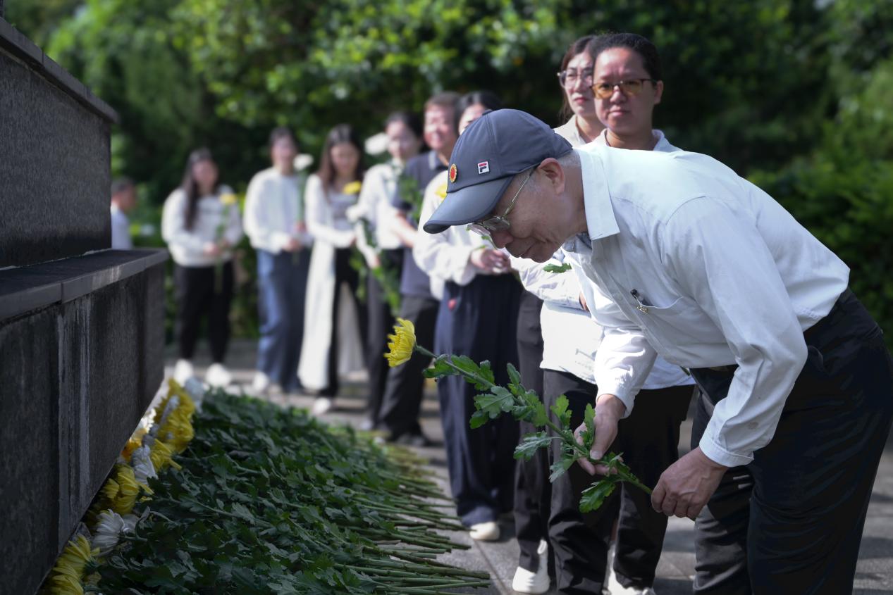 现场,学校马克思主义学院何楚婷老师以“铭记烽火岁月 传承英雄精神”为主题,讲述东江纵队在大埔围村的抗战事迹,重温革命先辈保家卫国的峥嵘岁月。甘泉颂合唱团合唱《如愿》,全体人员绕行纪念碑一周,敬献鲜花,寄托对先烈的哀思与敬意。