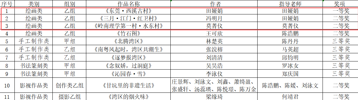 综上所述,田娅娟老师作品《东莞·西溪古村》荣获一等奖、莫菁仪老师作品《岭南理学第一村·水东村》荣获二等奖,田娅娟老师指导冯明月同学完成的作品《三月·江门·红卫村》荣获二等奖,田娅娟、莫菁仪老师分别获得优秀指导教师奖。
