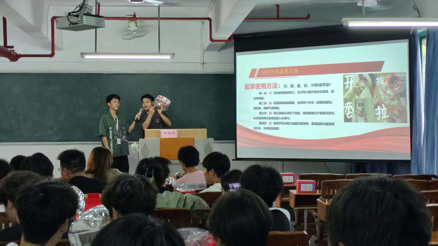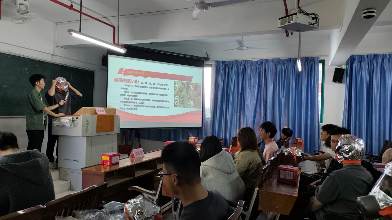在教室内,消防专员通过黑板与多媒体屏幕,详细演示了消防防毒面罩的“开、拔、套、拉”四步操作法,强调“30秒内正确佩戴可有效抵御火场有毒烟雾”。学生们认真聆听,并通过实物操作熟悉面罩的快速佩戴技巧。消防专员特别指出,需确保头罩与面部紧密贴合、长发完全纳入罩内,以保证防护效果。