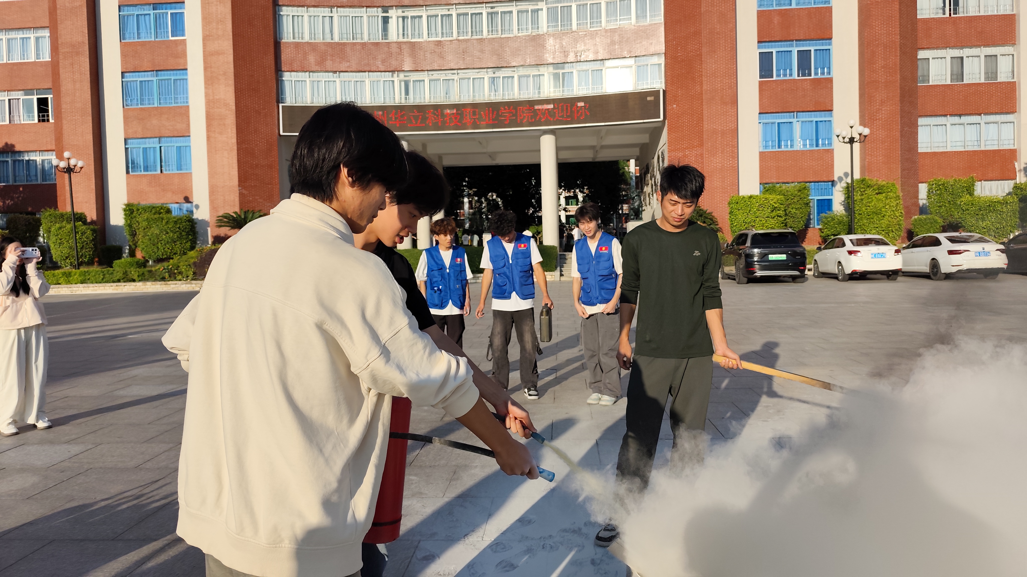 在综合楼前的广场上,消防专员重点讲解了干粉灭火器的使用步骤。学生们轮流操作,对准模拟火源进行扑救。一名参与演练的学生表示:“亲手操作灭火器后,对初期火灾的应对更有底气了。”消防专员还纠正了操作姿势,强调“对准火焰根部喷射”的关键要点。