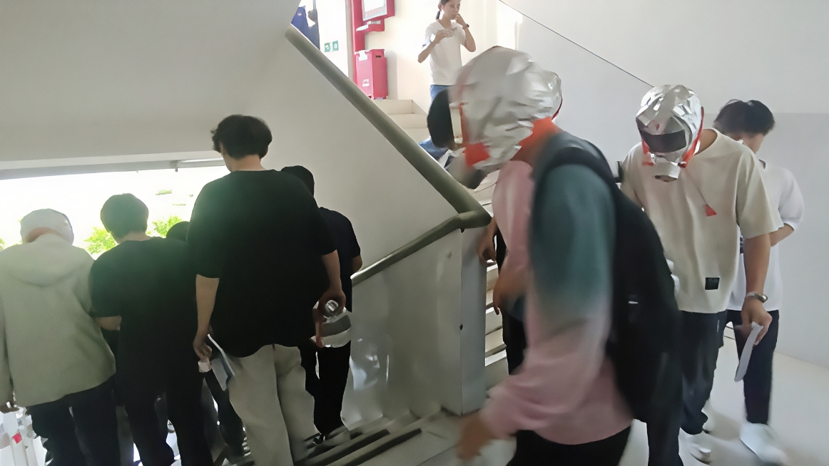 随着模拟火灾警报声急促响起,消防逃生演练正式启动。假定实训室突发 “火情” 并产生大量烟雾,各楼层疏导员迅速到位,引导教室内师生用湿毛巾捂住口鼻,弯腰低姿沿安全通道快速撤离。过程中,师生们听从指挥、井然有序,避开电梯、紧贴墙面快速移动,仅用 3 分 40 秒便全部撤离至操场指定安全区域,疏散过程零意外、零拥堵。