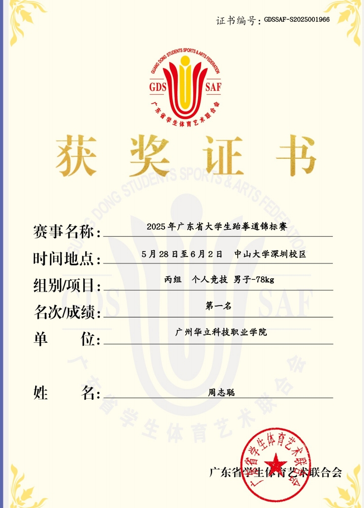广东省大学生跆拳道锦标赛 男子(78kg)项目第一名