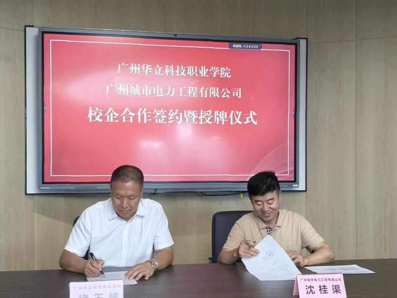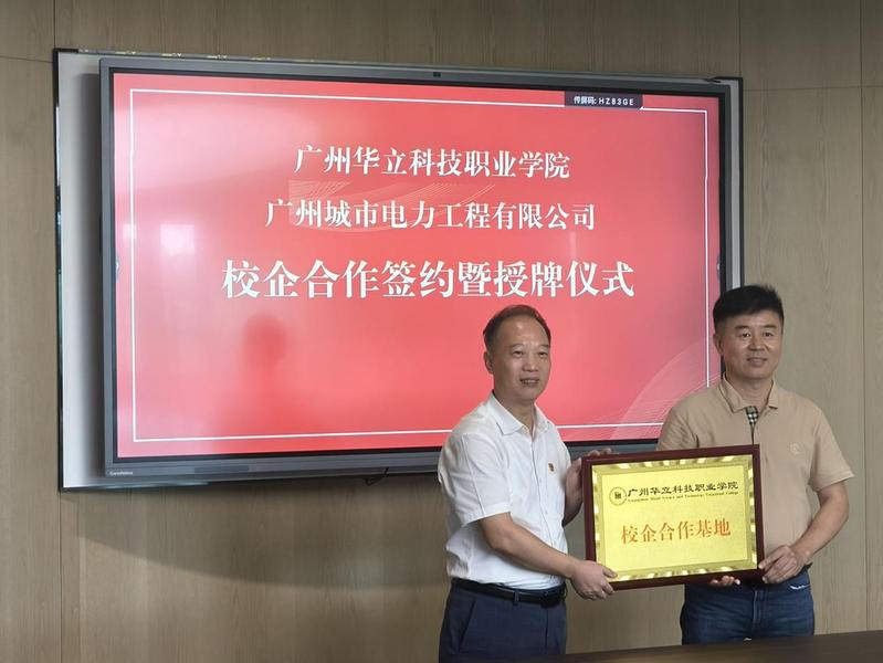 交流结束后,电力与智能制造学院院长褚玉峰与广州城市电力工程有限公司总裁沈桂渠续签了校企合作协议书,陈良声书记为企业授了“校企合作基地”牌子。