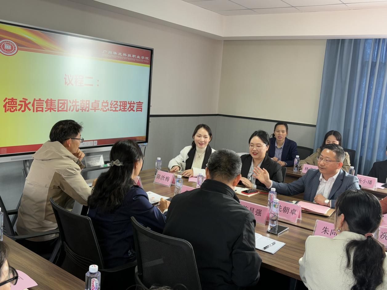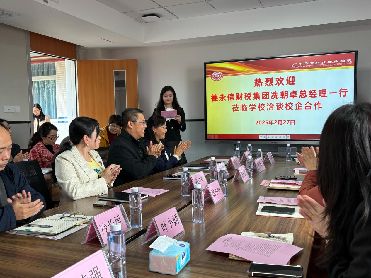 2025年2月27日,深圳市德永信财税集团有限公司总经理冼朝卓先生率领集团下各子公司高管们一行莅临广州华立科技职业学院经济管理学院参加“共育匠才 ‘职’ 通未来” 产教融合洽谈会。学校副校长陈显强教授亲临会场,陪同参会的还有教务处处长王泽秀及产教融合办韦建林主任。