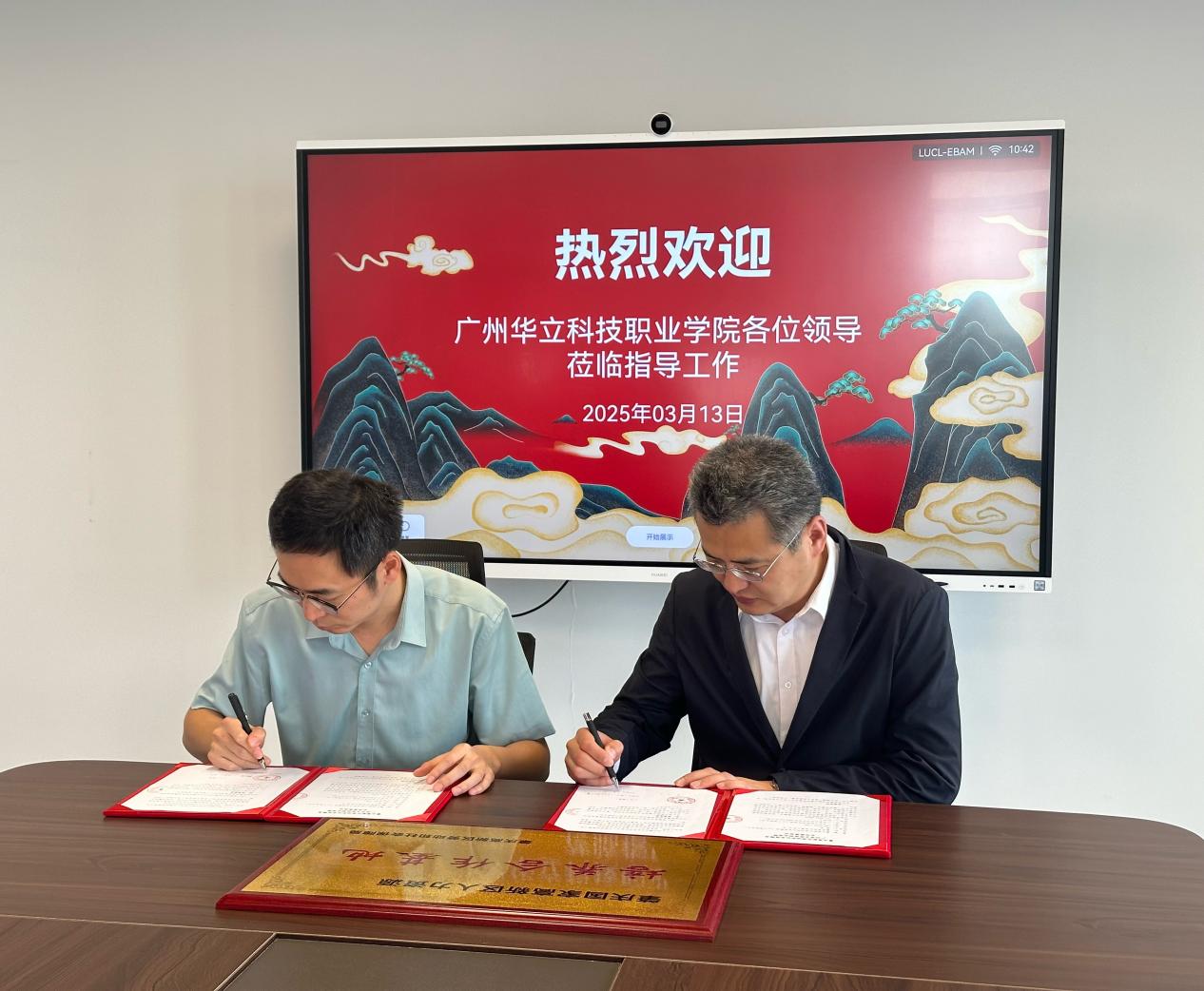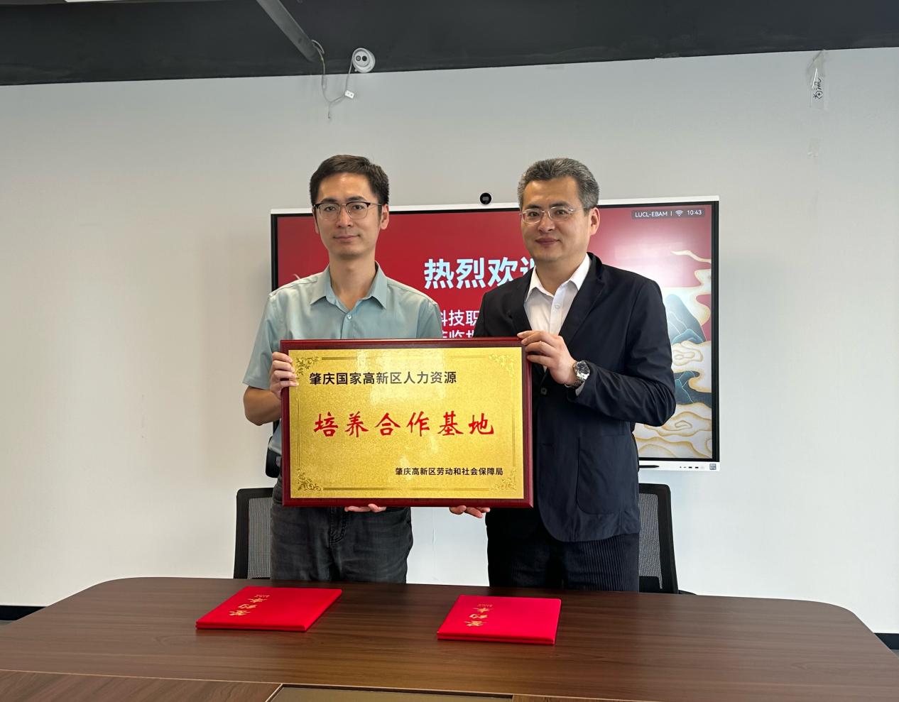 在校政企合作交流会上,肇庆高新区劳动社保局副局长柴子龙介绍了肇庆高新区产业布局及人力资源需求情况,张校助介绍了我校办学定位、专业设置以及2025年学生就业和实习工作情况。经过深入交流和探讨,双方就开展人力资源供需对接、订单式人才培养等事宜签订了合作框架协议,肇庆高新区劳动社保局授予我校“肇庆国家高新区人力资源培养合作基地”牌匾,为政校企未来的深度合作奠定了基础。