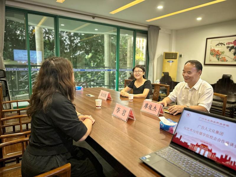 2025年9月16日,广告人文化集团(天津)有限公司总裁办公室主任李君一行到访广州华立科技职业学院,与校方就深化校企合作、推动产教融合展开座谈交流。广州华立科技职业学院校长廖俊杰、艺术与传媒学院党总支书记陈改梅等出席本次会议。