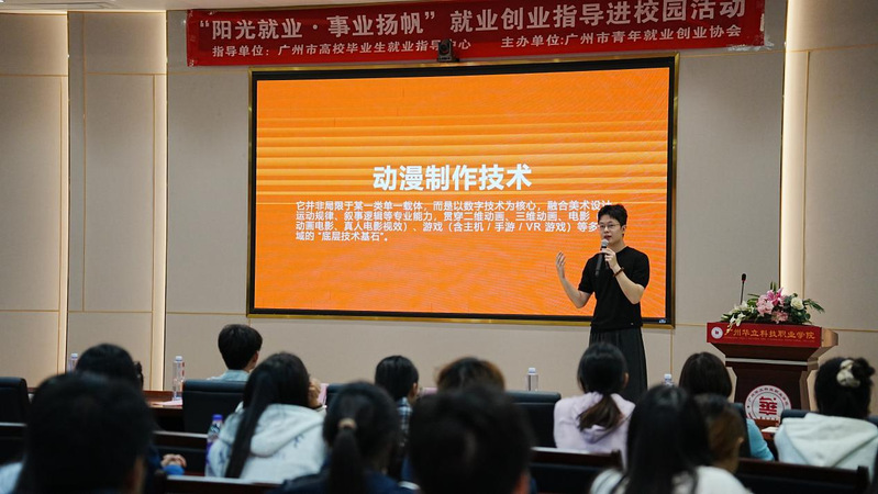 仪式结束后,活动进入阳光就业·事业扬帆——“数艺世界就业创业经验分享”主题讲座环节。黄龙城项目总监结合数字艺术行业的现状与发展趋势,分享了宝贵的职场经验与创业心得。他用生动的案例和实用的建议,为在场同学分享如何制作一部动漫电影。在互动环节,同学们踊跃提问,与企业专家进行了深入的交流。