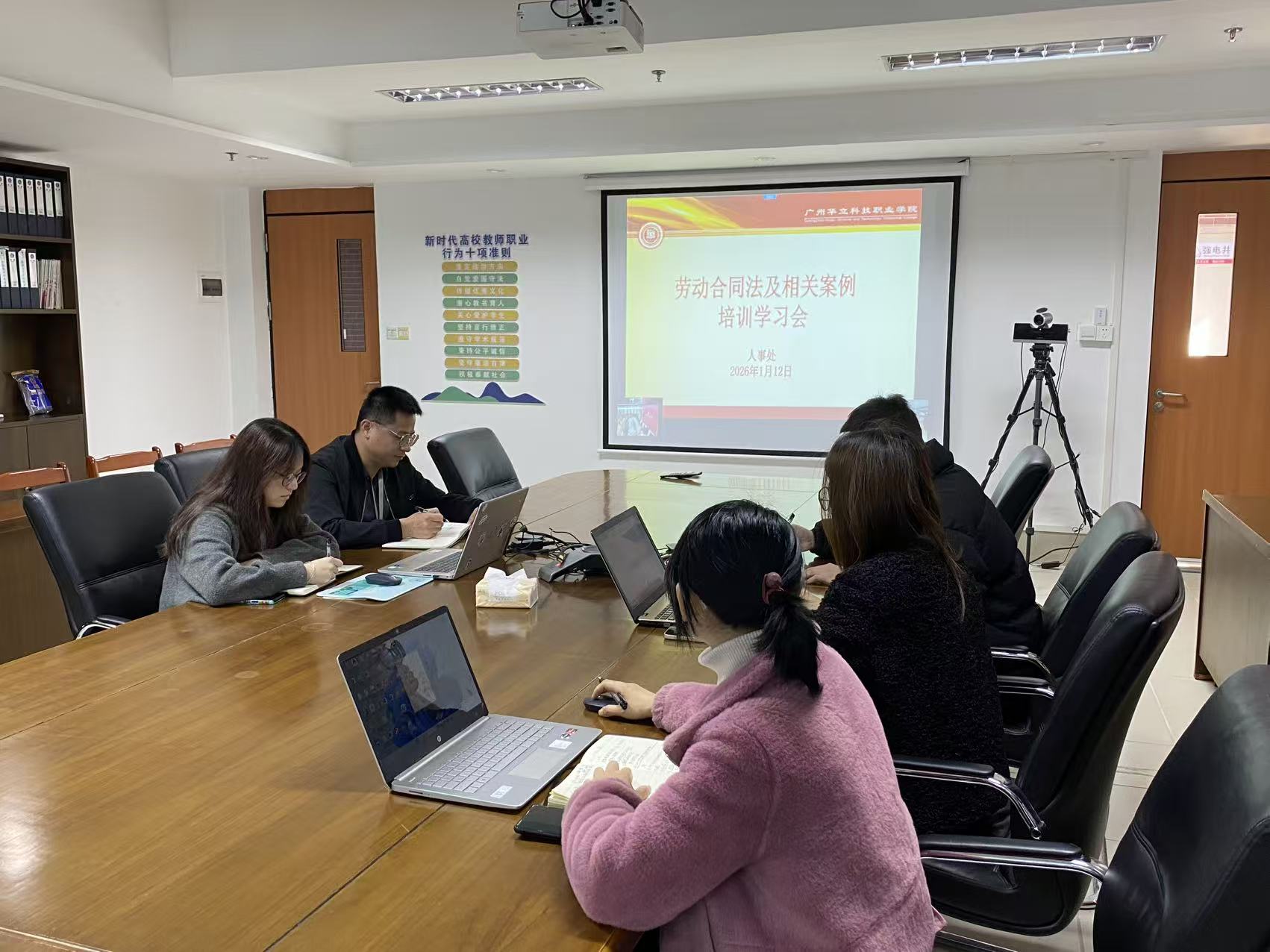 为进一步提升学校合规管理水平,增强风险防范意识,确保教职工手册、劳动合同、规章制度等合法有效,学校于2026年1月12日组织人事管理工作人员开展劳动合同法及相关案例学习培训。