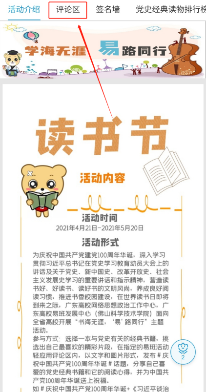 3.参与方式:选择一本与党史有关的经典书籍,挑选出自己最喜欢的精彩片段,在指定的易班活动轻应用评论区内,以文字和图片形式,发布#庆祝中国共产党100周年华诞#话题,分享自己喜爱的党史经典书籍和的阅读心得,并为中国共产党100周年华诞送上祝福。