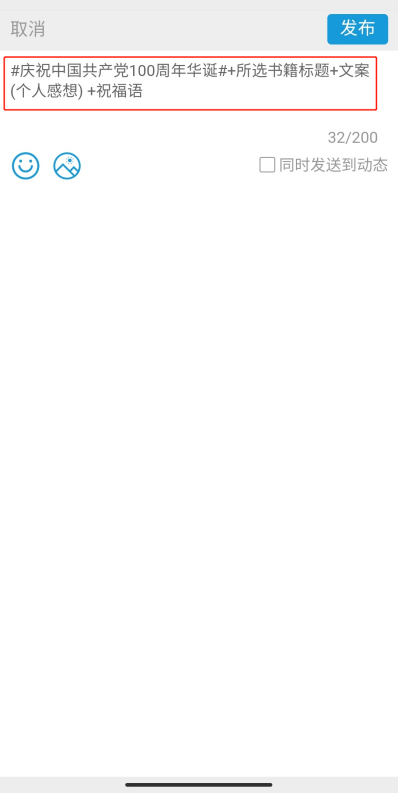 如: #庆祝中国共产党100周年华诞#+所选书籍标题+文案(个人感想) +祝福语。