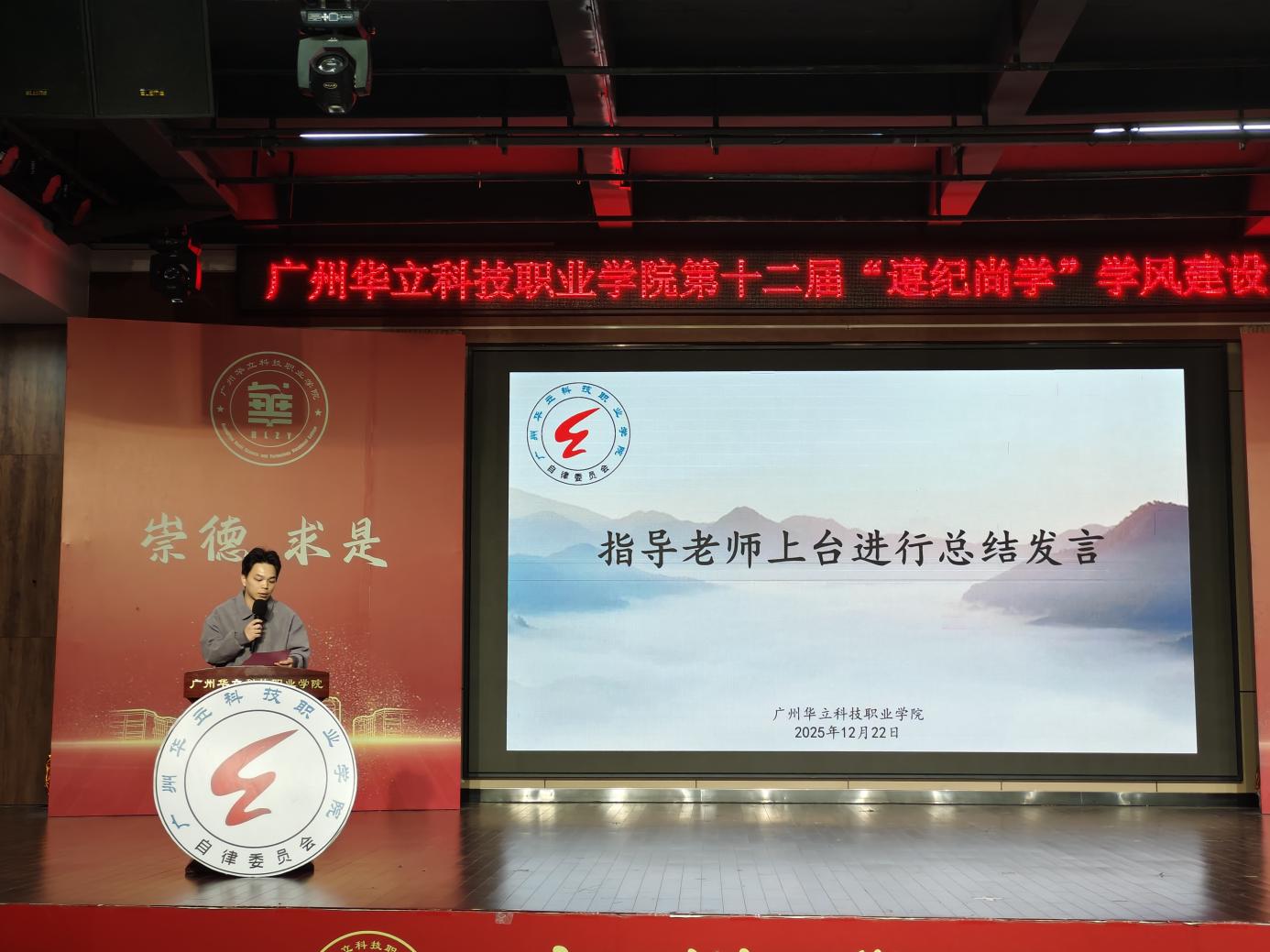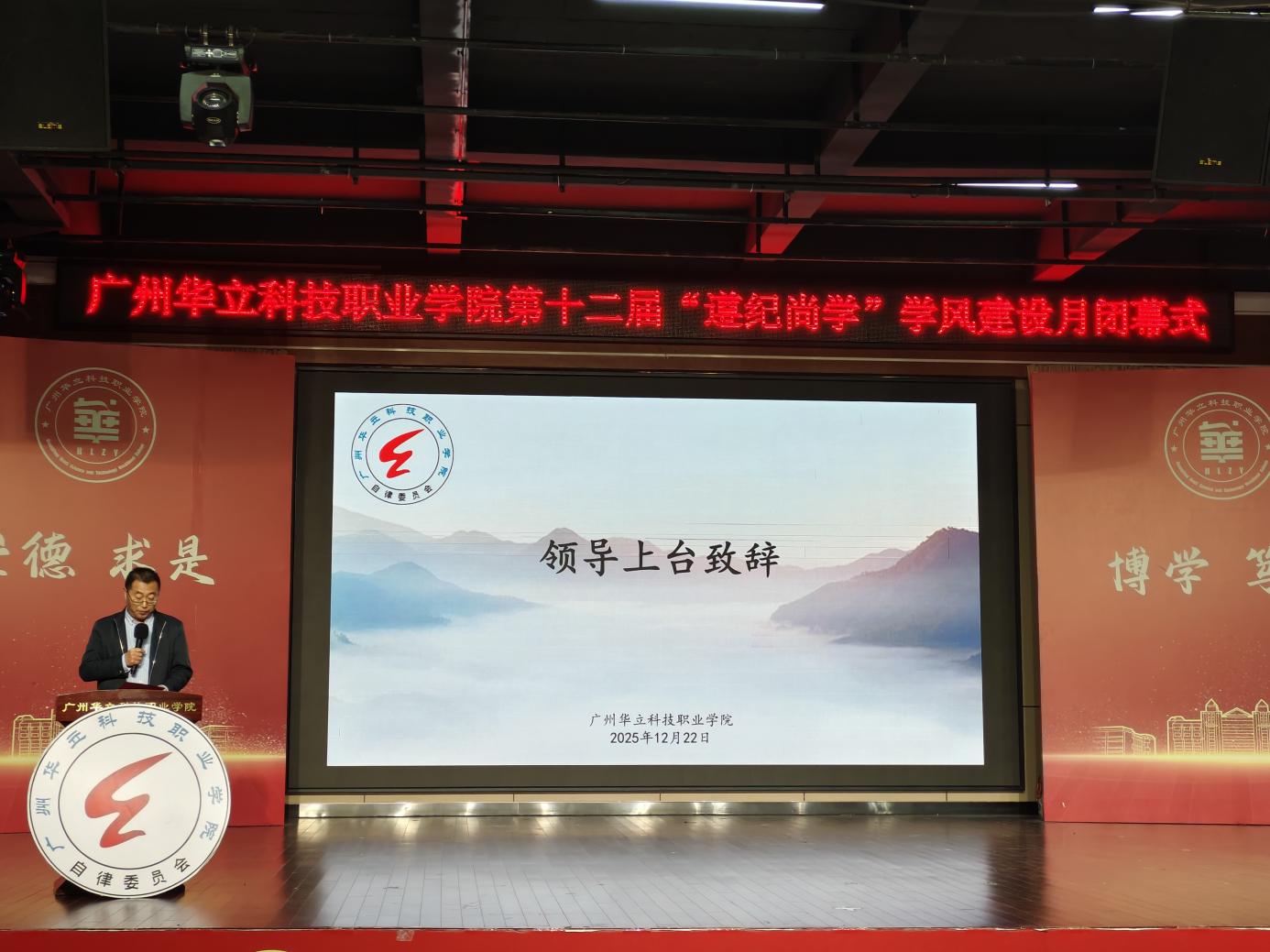 随后,大会通过专题短片回顾了学风建设月的精彩历程,从禁止早餐、拖鞋进教室、防诈骗海报、重阳节手抄报、宿舍一角、华立之美、致最牵挂的人一封信等6项系列活动,全方位呈现了全校师生积极参与、共同践行 “遵纪尚学” 的良好风貌。