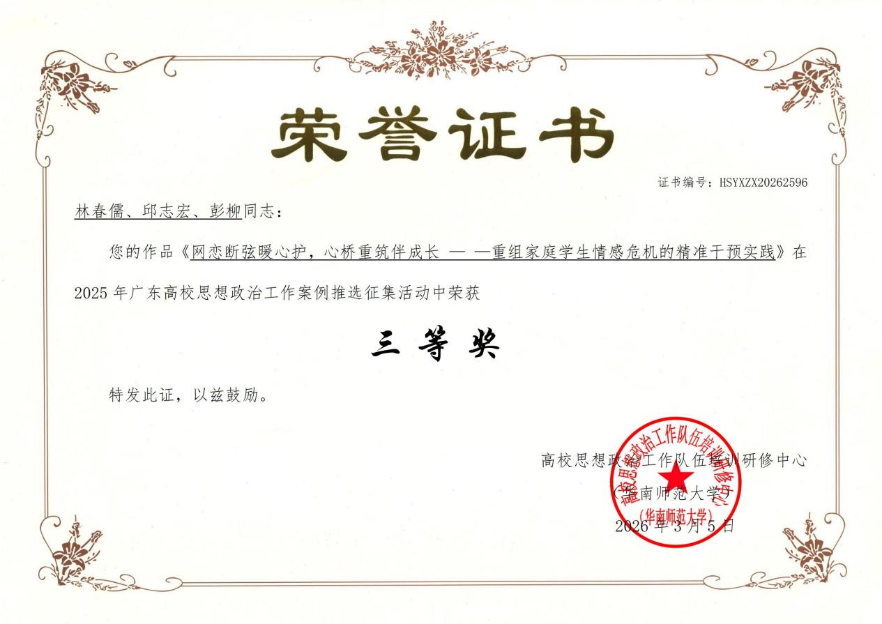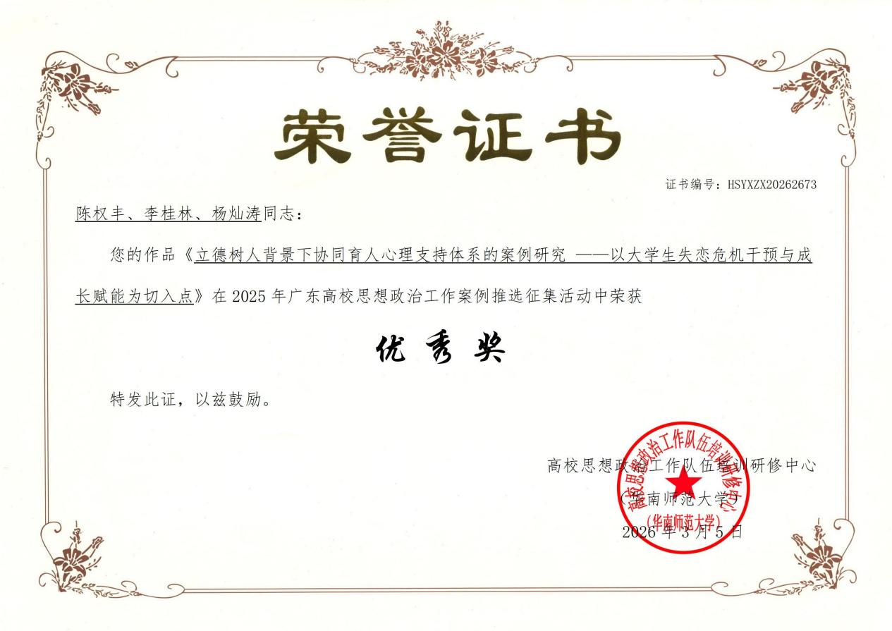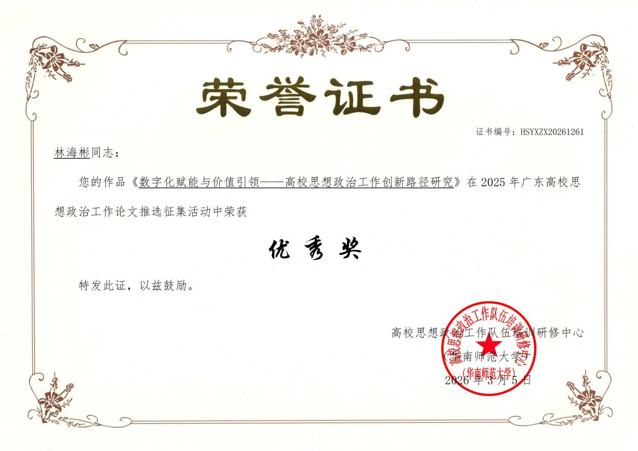 近日,高校思想政治工作队伍培训研修中心(华南师范大学)和教育部高校辅导员培训和研修基地(华南师范大学)公布了2025年广东高校思想政治工作论文、案例、网络课程推选征集活动结果。我校积极组织思政工作队伍参与评选,经专家评审,最终斩获13项荣誉,名单如下: