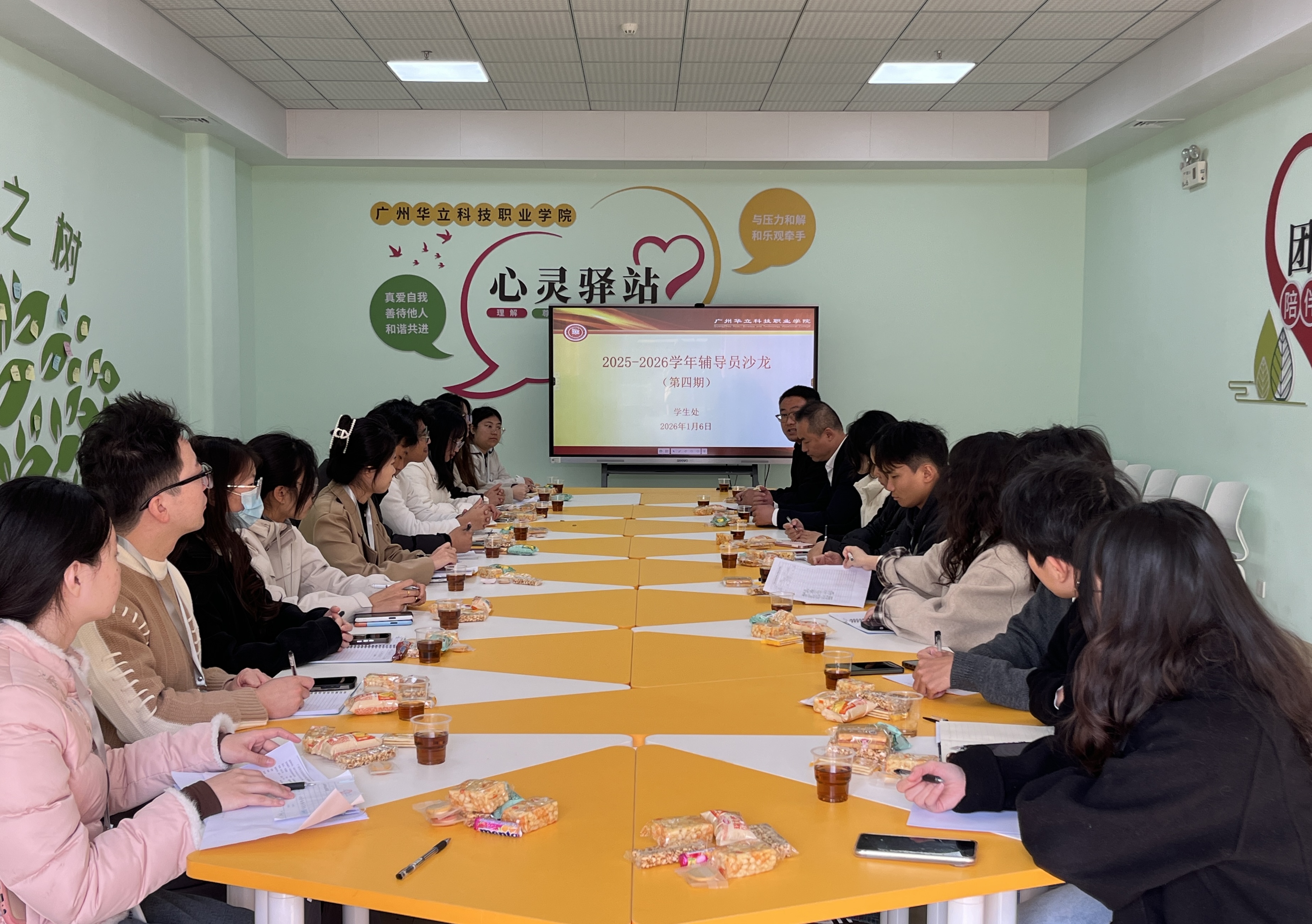 在高校学生管理工作中,辅导员作为基层工作者,其日常事务管理能力直接关系到学生的成长体验与校园生态的良性运转。为有效破解学生管理工作实践难题,切实提升辅导员育人履职能力,广州华立科技职业学院于2026年1月6日,在云浮校区心理咨询中心成功举办以“精细服务,协同共育”为主题的第四期辅导员沙龙。党委副书记、副校长高尧来,学生处处长李桂林、副处长李同同,学生处副处长助理杜盈盈,学生处各科室老师,以及各二级学院辅导员代表共同参与,围绕学生管理工作中的难点、经验与方法创新展开深入研讨。