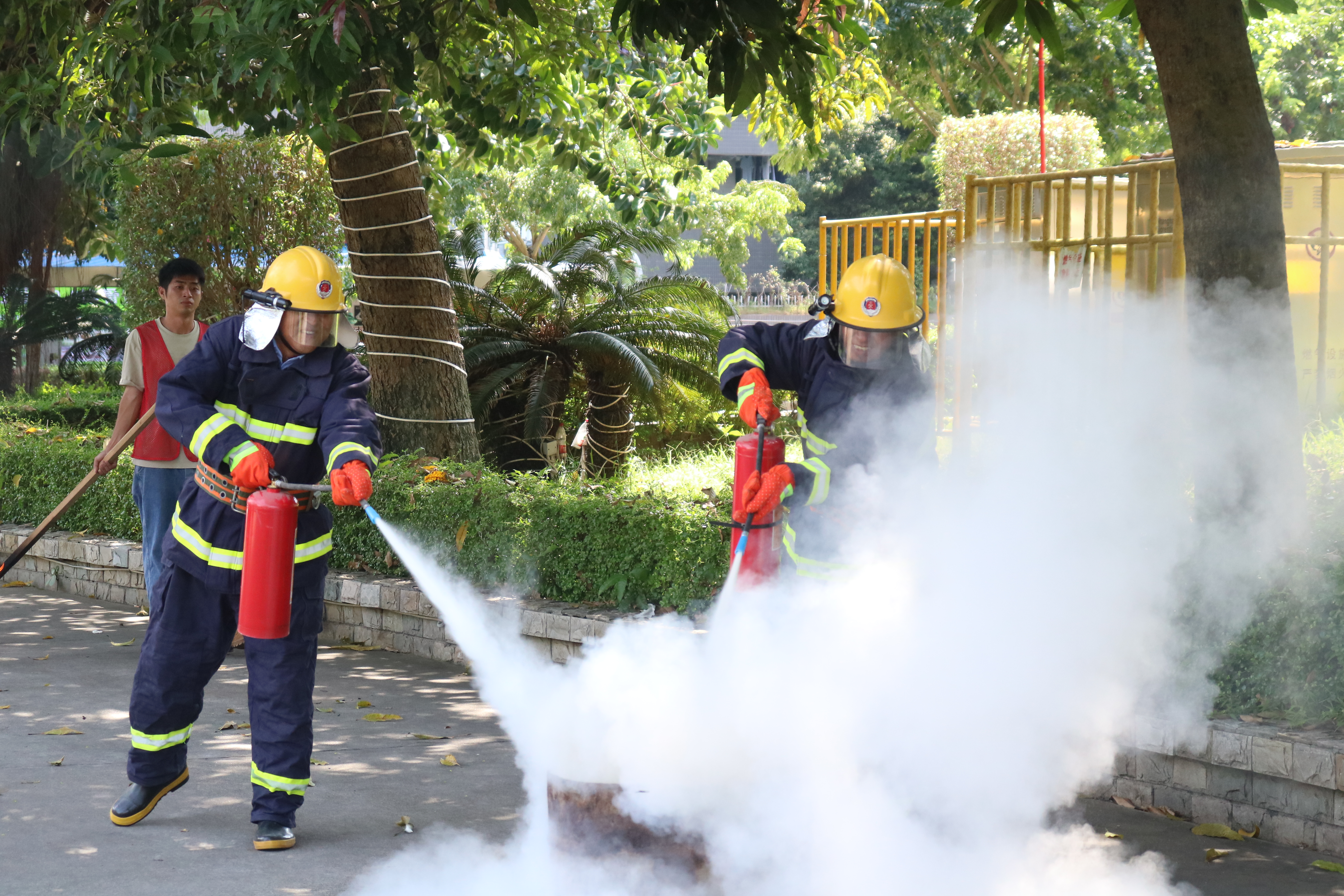 演练内容包括火灾疏散、灭火器使用、消防水带操作等环节。在模拟火情场景中,饭堂后勤管理人员迅速有序地撤离至安全区域,并在消防专员的指导下实操灭火器材,掌握了初起火灾的扑救方法。