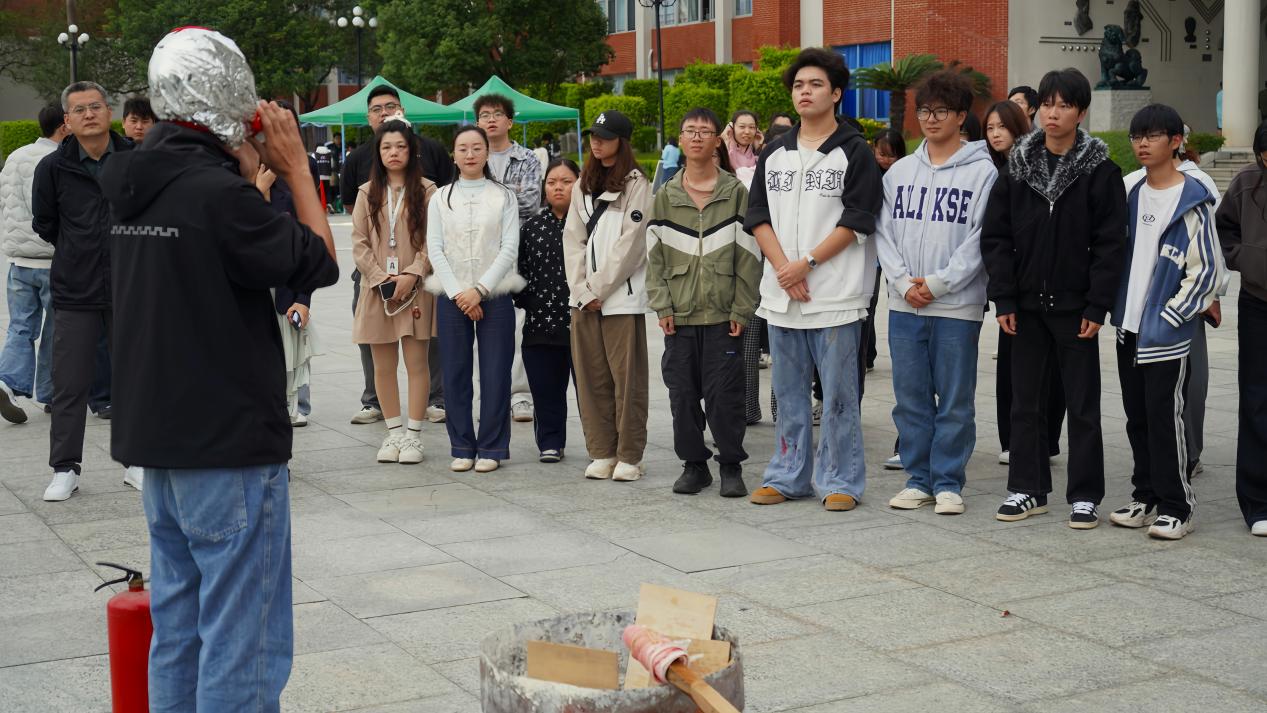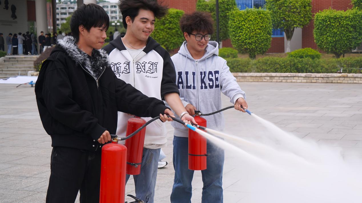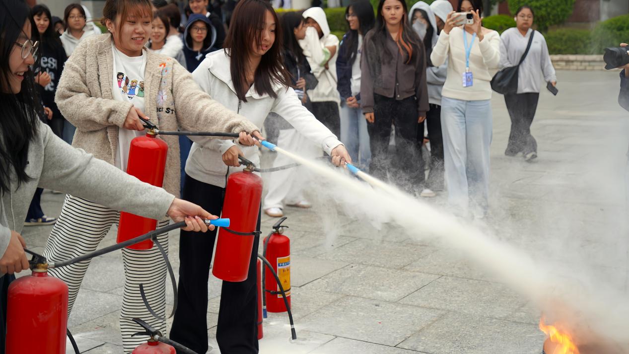 全体演练人员安全到达一楼空旷处后,由保卫处老师教大家如何正确使用灭火设备,并组织师生进行消防灭火设备实战操作。