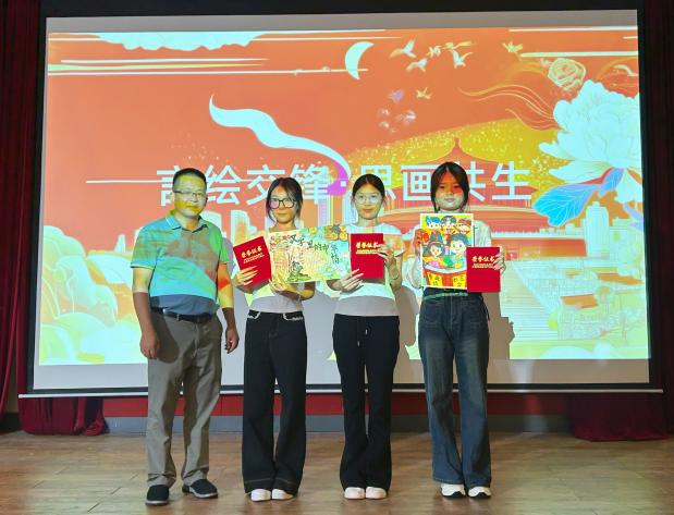 秋韵初染的华立校园,一场语言与绘画交融的特色活动圆满落下帷幕。值此第28届全国推广普通话宣传周之际,我校于图书馆小礼堂举办“言绘交锋·思画共生”校决赛,比赛现场灯火璀璨,笔墨与思想交汇,色彩与乡音交融。本次比赛由教育学院邱钧明、谭燕勤、张志杭、栾瑞林,学校团委雷洋五位老师担任评委,与现场师生共同见证这场国家通用语言文字的绚丽之旅。