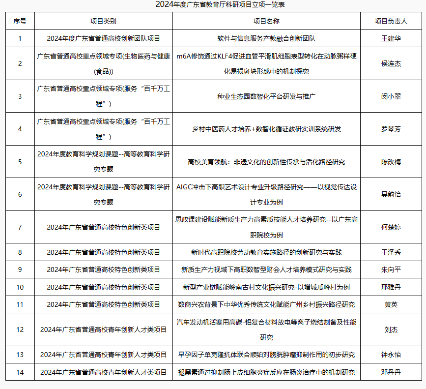 近日,广东省教育厅发布了2024年度普通高校重点科研平台和项目、广东省教育科学规划项目以及广东省普通高校认定类科研项目的立项名单。我校共计获得14项科研项目立项,在多个科研领域立项工作方面成功实现了新的突破。