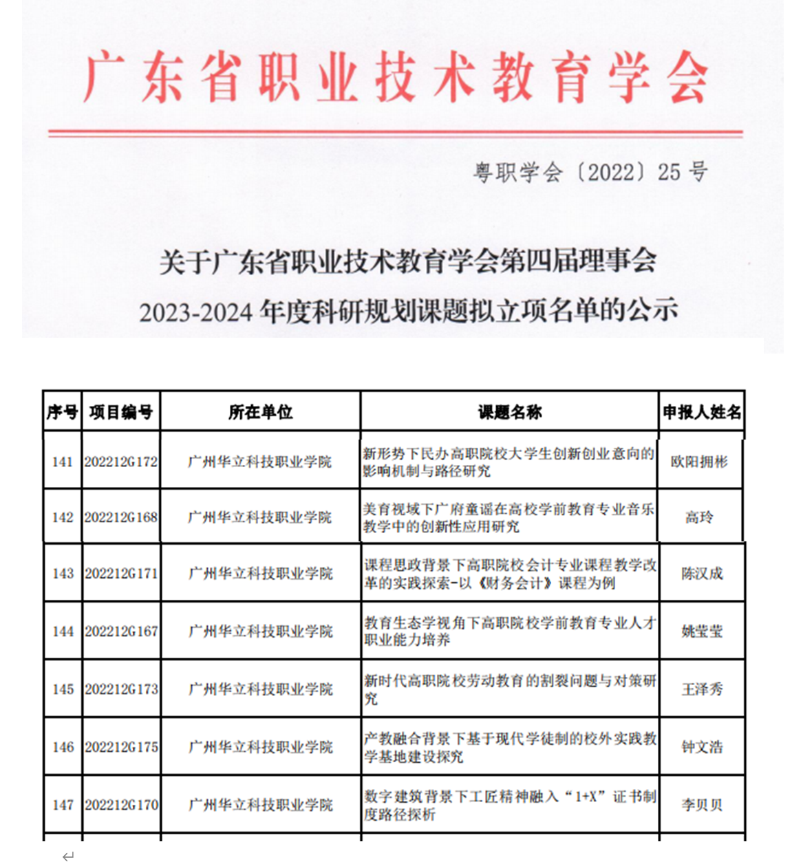 近日,关于广东省职业技术教育学会2023-2024 年度科研规划课题拟立项名单的公示。我校欧阳拥彬等7位老师获得立项。具体立项情况见下表截图。