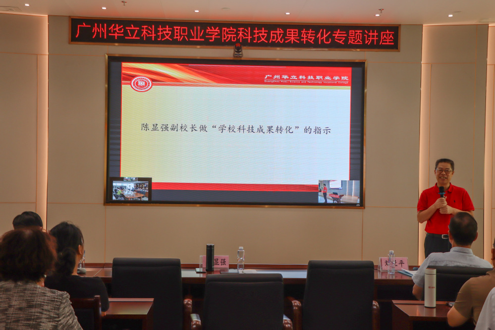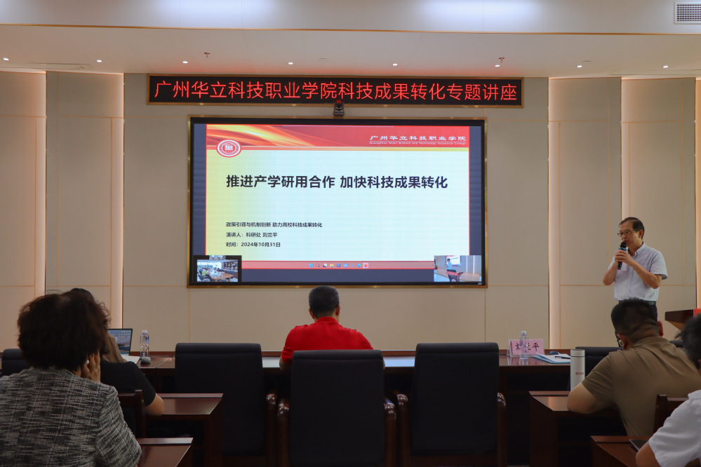 刘兰平处长以“推进产学研用合作,加快科技成果转化”为主题,围绕科技成果转化的重点要素展开了专题讲座,他分别从“政策背景、主要任务、推进举措”等三个方面对科技成果转化工作做了详细阐述。政策背景方面,从党的二十届三中全审议通过的《中共中央关于进一步全面深化改革、推进中国式现代化的决定》中汲取智慧,特别对第四部分《构建支持全面创新体制机制》做了深刻解读,强调了国家对科技成果转化的高度重视与战略部署。同时,紧密结合广东省最新政策动向,深入剖析近期发布的《广东省科技创新条例》、《广东省深化职务科技成果管理改革实施方案(2024-2027年)》等政策文件,凸显了省政府在推动科技成果转化方面的坚定决心和科技创新强省的具体部署。在主要任务方面,深入剖析广东省教育厅2024年9月发布的《广东省多举措推进高校科技成果转移转化》指导意见,从政策引领、源头供给、转化实效及强化保障等多维度,对省教育厅科技成果转化主要任务进行了详尽解读。在推进措施方面,立足我校实际情况,汇报了上半年科研平台与科技成果的调研成果,重点介绍了《广州华立科技职业学院知识产权和科技成果保护与转化管理办法(试行)》条例,为学校下一步的科技成果成果转化工作顺利开展,奠定了坚实基础。
