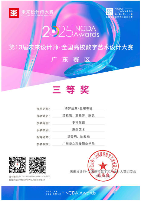 在2025年举办的第13届未来设计师·全国高校数字艺术设计大赛(NCDA)中,艺术与传媒学院师生凭借其卓越的创意和精湛的技术,荣获多项大奖。未来设计师·全国高校数字艺术设计大赛(NCDA)是入选《全国普通高校大学生竞赛排行榜》,近20家省教育厅认定,“学习强国”学习平台支持,对接联合国国际赛的全国性大学生竞赛。是高校教育教学改革和创新人才培养的重要竞赛项目之一,具有极高的知名度与影响力。本次大赛是由全国高校数字艺术设计专业委员会主办,旨在挖掘和培养数字艺术设计领域的未来之星,大赛已连续举办13届,为艺术设计领域的高水平知名赛事,是我院师生积极参与的重要专业竞赛之一。