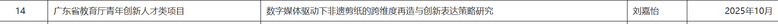 2025年8月,《十五运会和残特奥会粤港澳协同发展理论与实践研究项目》立项名单公布,学院朱君老师的《十五运会志愿服务助力大学生核心素养培育研究》、冼晓茵老师的《粤港澳联合办赛对国家统战大局的影响》两项课题成功获批。2025年10月,省教育厅青年创新人才类项目立项中,学院刘嘉怡老师的《数字媒体驱动下非遗剪纸跨维度再造与创新表达研究》成功获批。