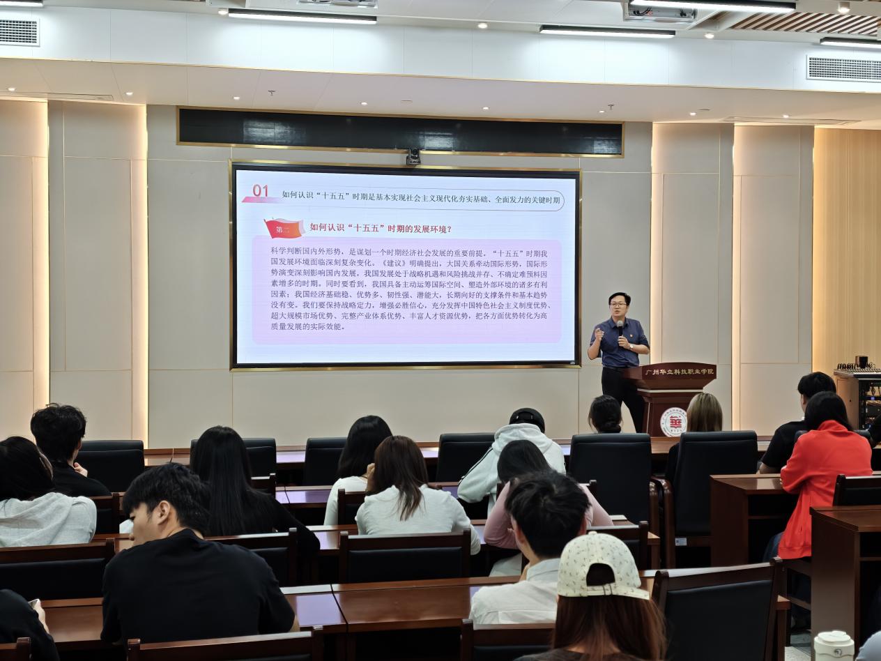 为深入学习贯彻党的二十届四中全会精神,引导青年学子认清时代方位、勇担青春使命。2026年3月17日,艺术与传媒学院朱君院长以“奋楫‘十五五’新征程,笃行报国新担当”为主题,为25级学前教育、体育教育专业的学生们带来了一堂思想深刻、内涵丰富、催人奋进的思政教育课。