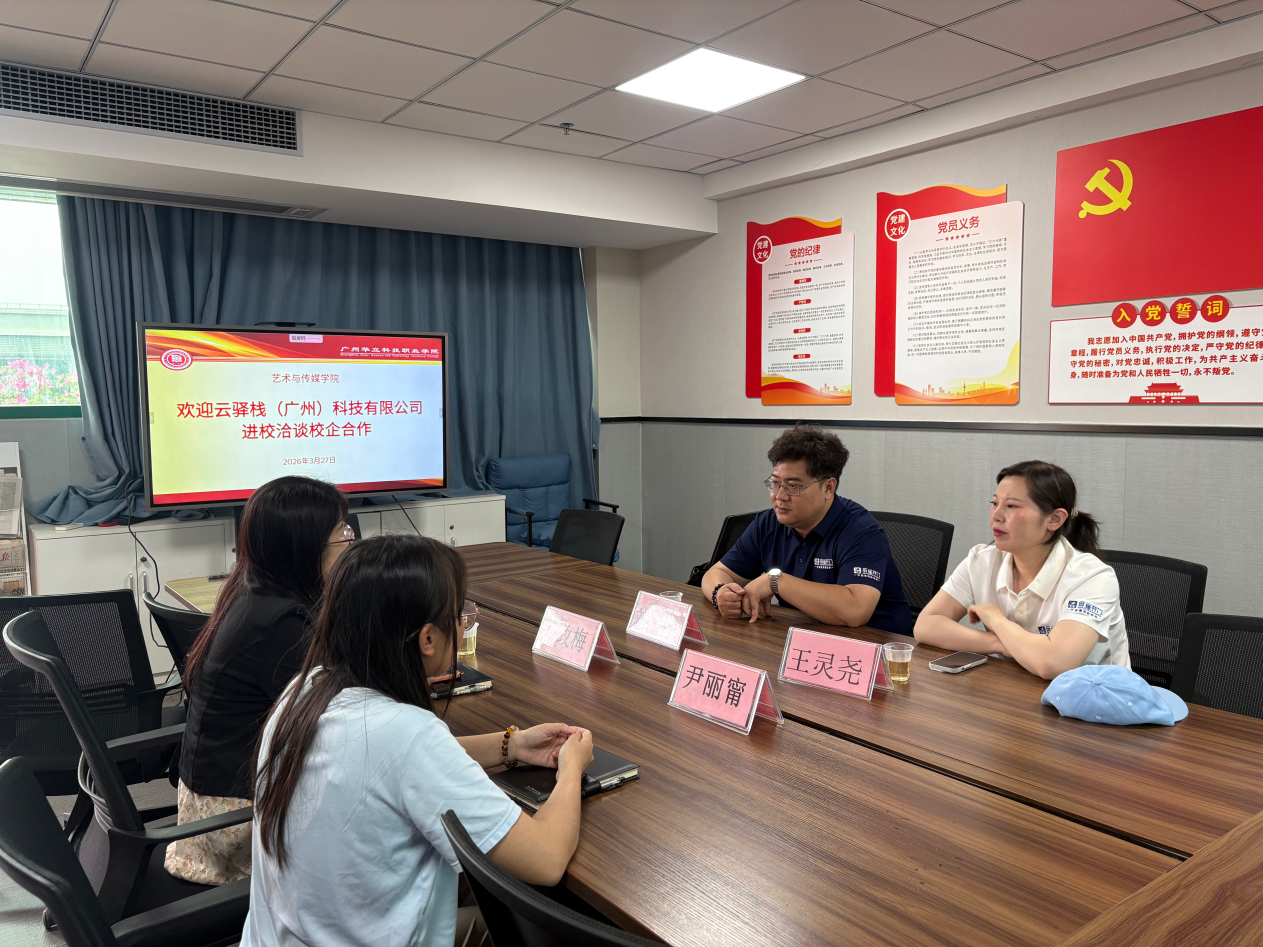 为深化产教融合、筑牢实习实践平台,助力学生职业能力提升,3月27日,云驿栈(广州)科技有限公司市场部总监刘桦、人力资源部主管王灵尧一行莅临我校艺术与传媒学院,就校企合作及学生实习工作展开深度洽谈。艺传学院党总支书记兼副院长陈改梅、教科研办公室副主任尹丽甯、校外教学干事李子接待并出席座谈会,双方围绕实习实训、人才培养等核心议题达成初步合作意向。