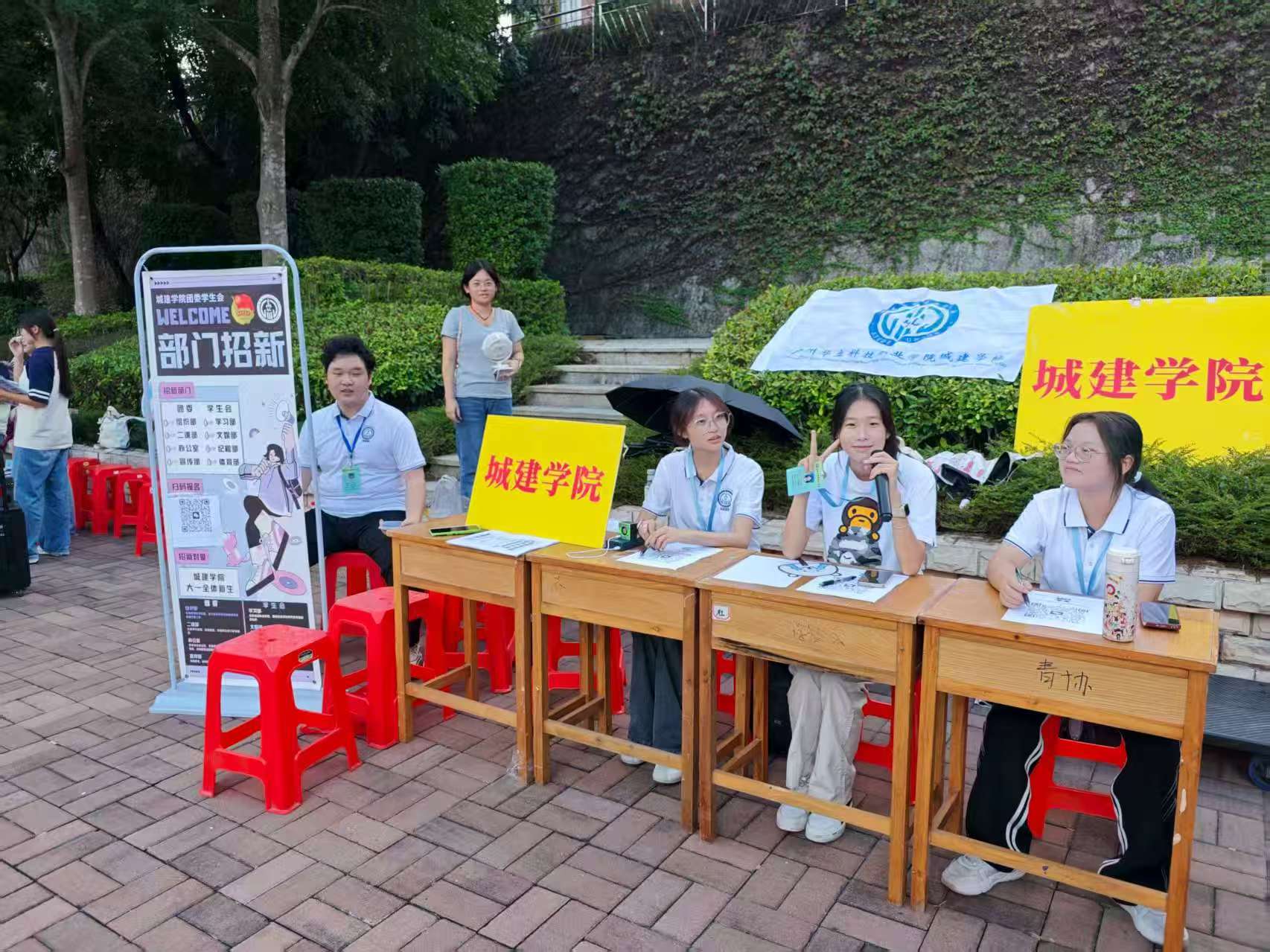 2025 年 9 月 15 日,城建学院团委学生会在图书馆楼下小广场正式举行招新活动。学院党总支书记、副院长吴毅强,团委书记杨威豪及全体辅导员老师来到招新现场,了解招新组织情况,并与工作人员、咨询学生亲切交流,详细询问团学各部门招新需求、报名人数及学生意向偏好,为招新活动的顺利推进提供指导。