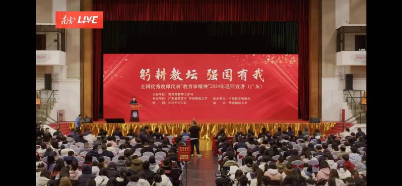 本次巡回宣讲活动来到华南师范大学,由6位全国优秀教师结合工作实际,分享了扎根讲台、潜心育人的感人故事,激励广大人民教师践行教育家精神。