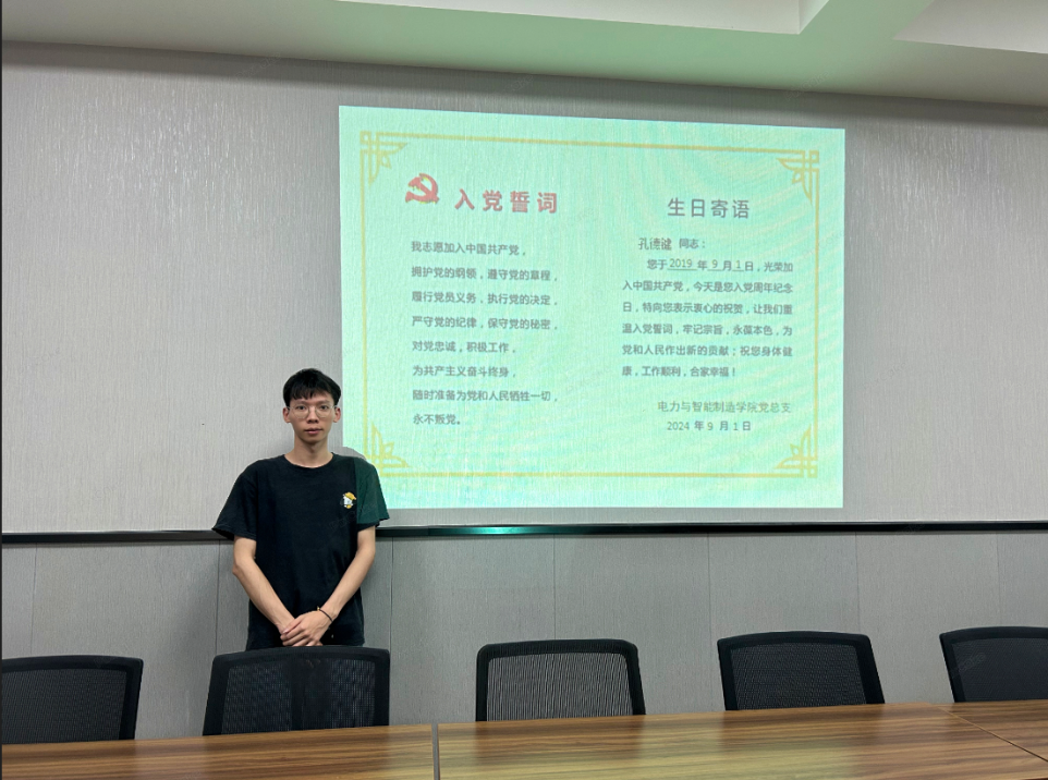 作为电力与智能制造学院云浮校区的一名教师党员孔德键,在收到学院党组织发来的“政治生日”贺卡后心情特别兴奋,也感谢组织的关怀。9月1日,是我的政治生日,我认为政治生日是表达对党的忠诚和坚定的重要时刻。火红的党旗永远飘扬在我心中,庄严的入党誓词永远融入我灵魂深处,它已转化成我行动的力量,使我以坚强的党员意志投入到党的工作中,甘于拼搏奉献。