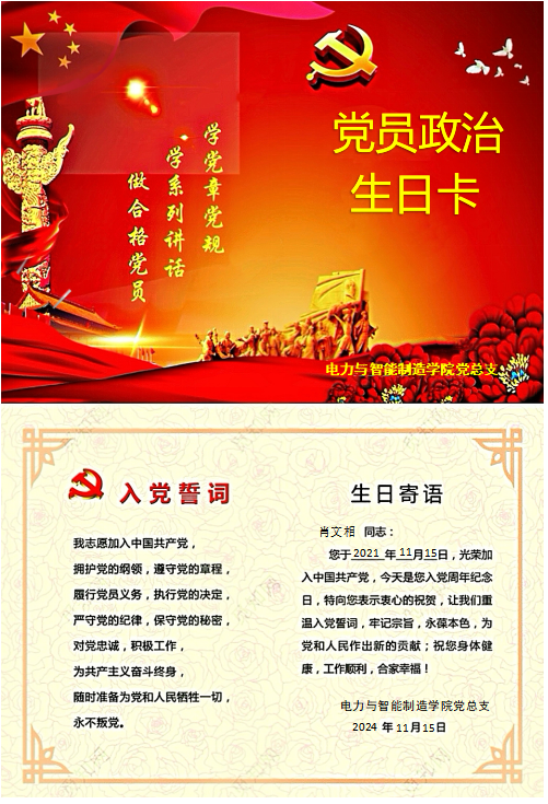 作为电力与智能制造学院的一名党员教师肖文相,在收到学院党组织发来的“政治生日”贺卡,我的心情格外激动,感谢组织的关怀。11月15日,是我的政治生日,这一天对我而言具有特殊的意义。我认为政治生日是表达对党的忠诚和坚定的重要时刻。火红的党旗永远飘扬在我心中,庄严的入党誓词永远融入我灵魂深处,成为我行动的力量源泉。