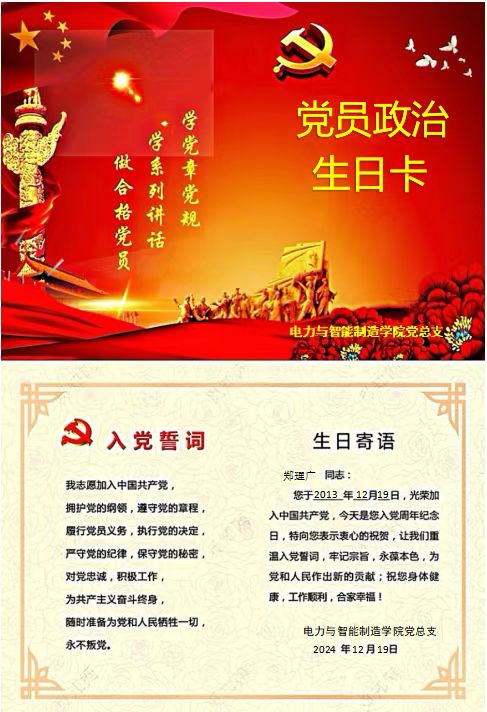 作为电力与智能制造学院的一名党员教师郑理广,在收到学院党组织发来的“政治生日”贺卡,我的心情特别兴奋,也感谢组织的关怀。12月19日是我的政治生日,这不仅是一个简单的纪念日,而是我内心深处对党深沉情感的流露,是我对党的无限忠诚和坚定信仰的深情表达。