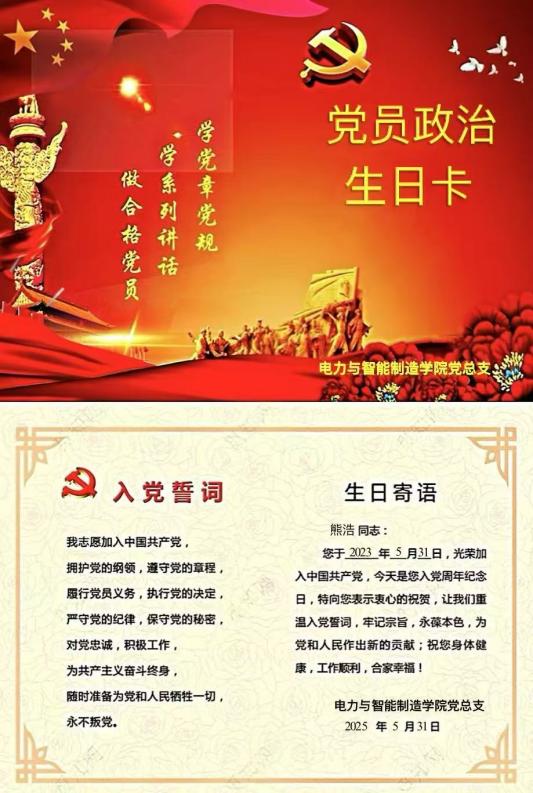 作为电力与智能制造学院云浮校区的一名教师党员熊浩,2025531日收到学院党组织发的“政治生日”贺卡,我满心欢喜,更怀着对组织深切关怀的感恩之情,迎来政治生日这一极具纪念意义的时刻——531日。于我而言,政治生日承载着对党无限忠诚与坚定信念的庄重宣示。回首往昔,入党时那火红党旗的鲜艳色彩,早已深深烙印在我内心深处,成为永不褪色的精神底色;而那庄严的入党誓词,每一个字、每一句话,都已融入我的灵魂,化作前行的不竭动力。这力量,赋予钢铁般的党性意志,让我在党的事业征程中,无畏艰难险阻,勇往直前。我愿将拼搏与奉献当作最质朴的行动语言,在党的工作中倾尽心力,不求回报,只盼为党和人民的事业添砖加瓦,用一生践行入党时的铮铮誓言,不负组织的培养与期望。
