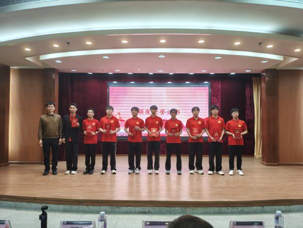(学院党委书记褚玉峰、党总支专职副书记郑理广、学生党建工坊指导老师王凯为获奖队伍颁奖)