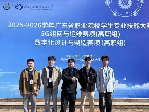 本次大赛由广东省教育厅主办,赛事紧密对接产业前沿,涵盖理论知识、实操技能与创新能力等多维度综合考核,竞争激烈。面对设备资源有限、备赛条件不足等现实困难,我院代表队迎难而上、沉着应战,充分展现了师生团结拼搏、追求卓越的精神风貌。
