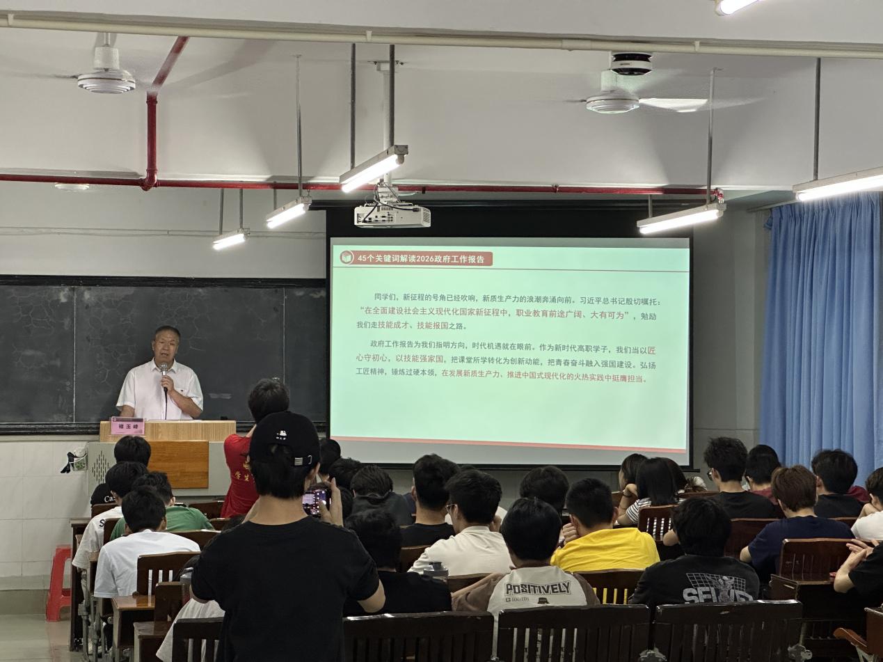 为深入学习贯彻2026年全国两会精神,帮助我院学子找准时代定位、明确技能成才方向,3月25日,电力与智能制造学院在西一403课室开展春季学期“思政第一课”专题学习。学院党总支书记褚玉峰以《乘“新质”东风,铸技能之魂——从政府工作报告看高职学子的机遇与担当》为主题,为同学们讲授思政第一课。