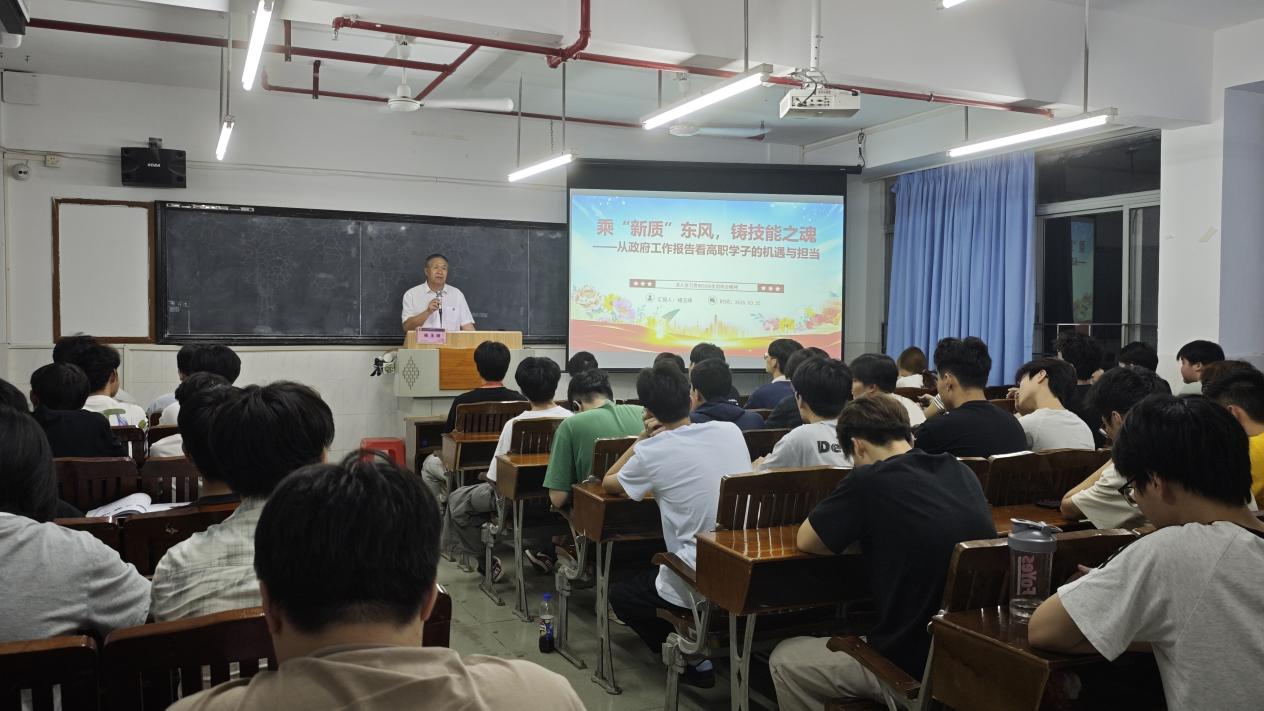 褚玉峰书记围绕政府工作报告核心内容,提炼出45个关键词,涵盖新质生产力、职业教育、技能人才、数字化转型等重点领域,以通俗语言、鲜活案例拆解政策内涵。他结合国家发展新战略与高职教育发展新形势,重点解读了“新质生产力”“产教融合”“技能强国”等关键词,指出新质生产力的培育离不开高素质技术技能人才,而高职学子正是这一队伍的中坚力量,职业教育已成为支撑产业升级、服务国家发展的“刚需”而非“兜底”。