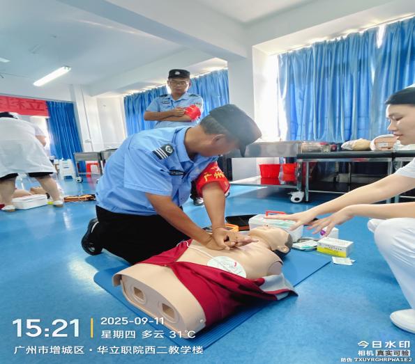 为提升校园应急救援能力,守护师生生命健康,2025年9月11日,学校精心策划并组织了一场极具价值的应急技能培训活动。此次活动由健康学院护理专业教师进行培训,参与人员广泛,涵盖了全体辅导员、保安员、宿管员,以及国防协会和消防协会学生干部,大家汇聚一堂,共同踏上这场关乎生命安全的求知征程。