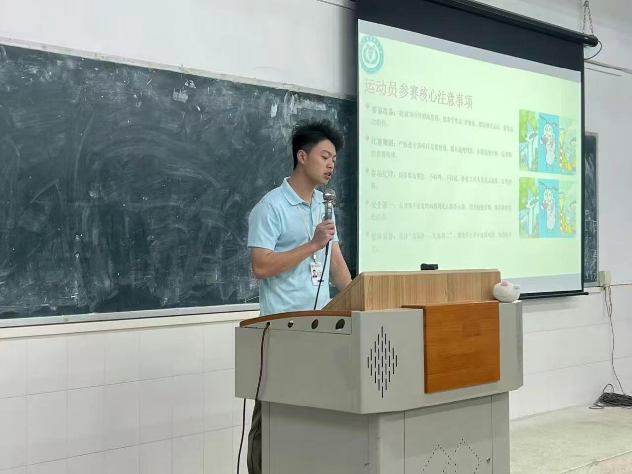 会上,王腾辉同学向大家提出以下的相关要求:运动员需提前30分钟到场签到、携有效证件热身,严守竞赛规则与赛场纪律,秉持“安全第一、友谊为先”原则文明参赛;志愿者需提前1小时到岗,着装规范、热情尽责,服从安排并保障自身与服务对象安全。