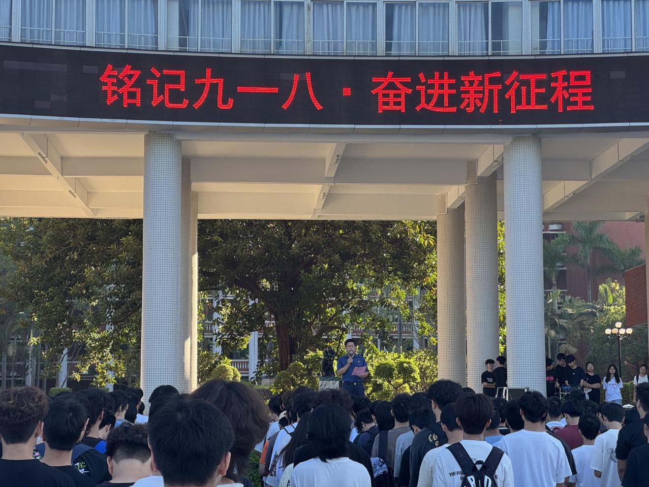 2025年9月15日上午7:30,秋高气爽,计算机信息工程学院25级新生首次升旗仪式在综合楼楼下广场庄严举行,校园内氛围庄严肃穆。正值“九一八”事变纪念前夕,师生共同以升旗仪式缅怀革命先烈、铭记历史。