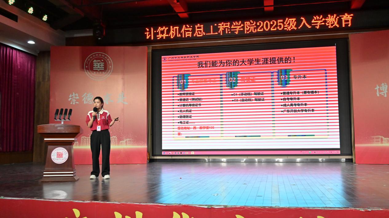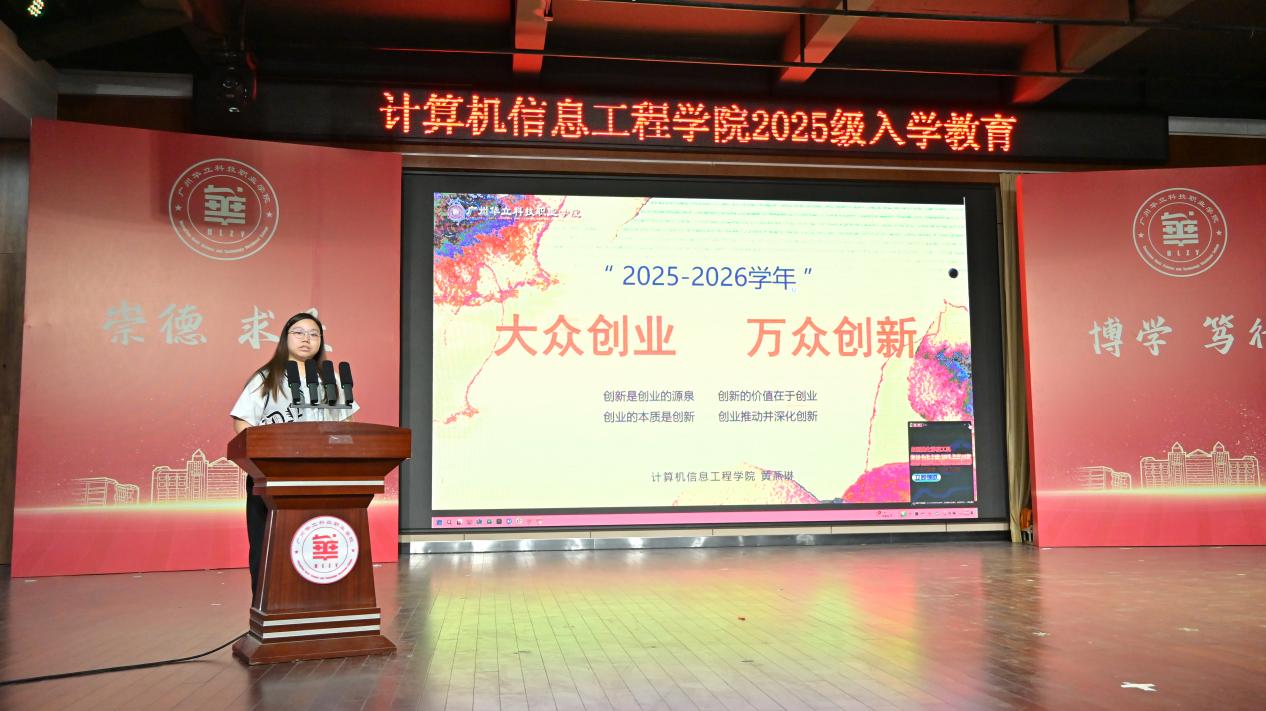 紧接着,黄燕琳进行创新创业宣讲。她分享了学校在创新创业方面的政策支持、成功案例以及各类创新创业赛事,激发了新生们的创新思维与创业热情,让大家了解到在大学期间除了专业学习,还能通过创新创业拓宽发展道路。