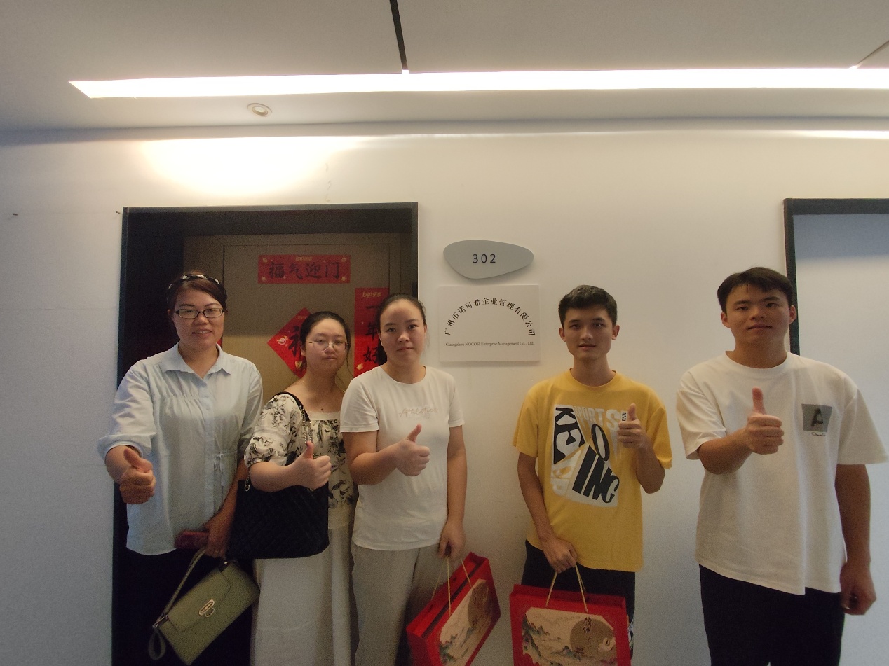 随后,学院教师一行前往广州市诺可希企业管理有限公司进行走访。公司负责人刘曼女士介绍了学生的岗位实践安排与表现。在与学生的座谈中,老师们同样给予了深切关怀与鼓励。并代表学校向实践学生分发了中秋慰问品。