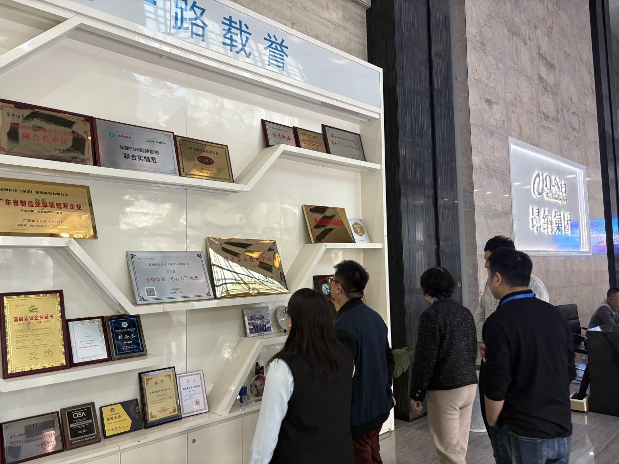 交流首站,学院领导参观了企业荣誉展示区:陈列的“广东省制造业单项冠军企业”等资质牌匾、合作荣誉,直观展现了昂纳在信息技术领域的行业影响力,也为双方后续沟通铺垫了产业实力认知基础。