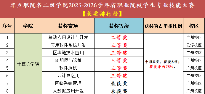 根据本次省职业院校学生专业技能大赛获奖数据显示,计算机信息工程学院共申报 8 个赛项,斩获 6 项奖项,获奖率达 75%。其中,“移动应用设计与开发” 赛项荣获二等奖,“应用软件系统开发”“区块链技术应用”“5G 组网与运维”“软件测试”“云计算应用” 5 个赛项分别斩获三等奖,充分展现了学院在计算机应用技术领域的扎实教学功底与学生过硬的专业技能。