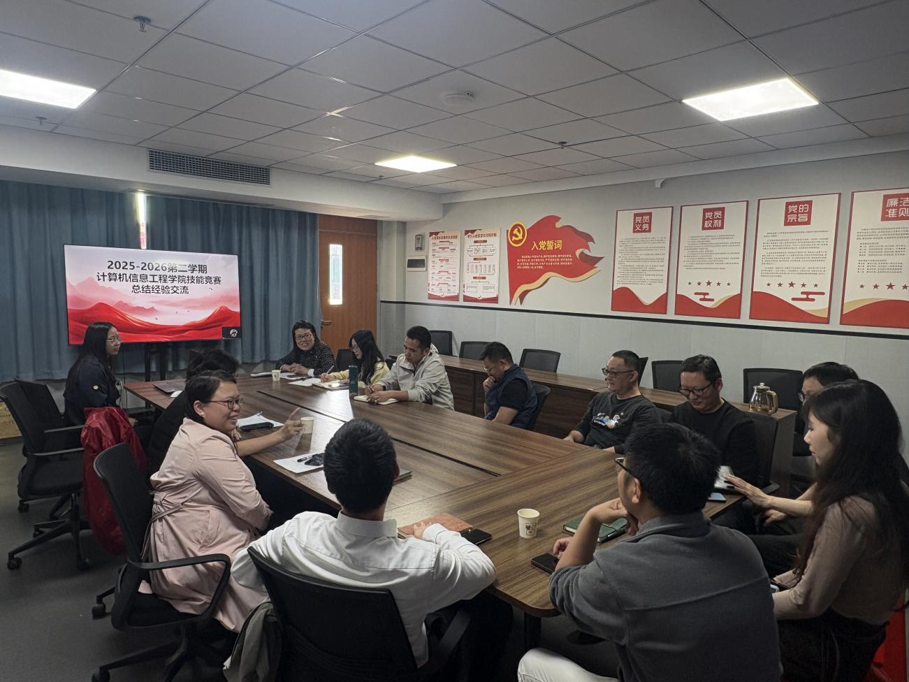 为总结竞赛经验、凝练育人成果,推动专业技能人才培养质量提升,2026年3月16日,计算机信息工程学院在会议室召开广东省职业技能竞赛总结经验交流会。学院院长王建华、副院长闵小翠,教科研主任及竞赛指导老师(云浮校区线上参加)齐聚一堂,围绕省职业院校学生专业技能大赛参赛与获奖情况展开深入交流。
