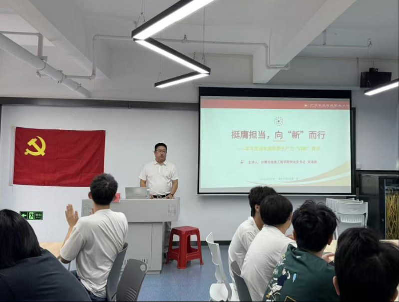 为深入学习贯彻习近平总书记关于发展新质生产力的重要论述,引领青年学子把握时代大势、勇担时代使命,2026年3月26日上午,计算机信息工程学院党总支书记宋海泉以“挺膺担当,向‘新’而行” 为题,为学院学生讲授思政第一课,围绕新质生产力 “四新” 要求,系统阐释时代召唤、根本遵循、教育使命与青年担当。